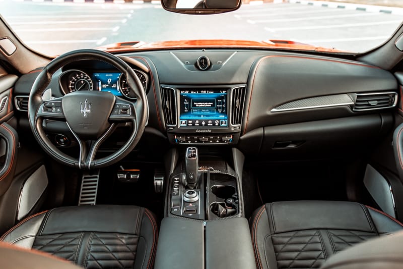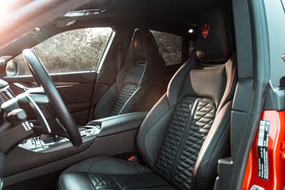 - Power-adjustable and climate-controlled front seats with quilted inserts and red Maserati Trofeo logo embroidery