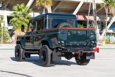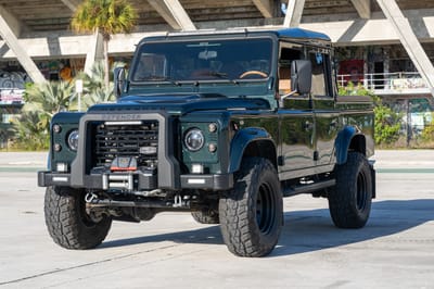SBX Cars is proud to offer for sale this 1998 Land Rover Defender 110, showing just 81 km (50 mi) on the odometer at the time of cataloging. Finished in Metallic British Racing Green over a two-tone brown and green leather interior, this left-hand-drive crew cab pickup was built under license in Turkey by Otokar and comprehensively refurbished in the United States.