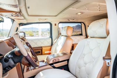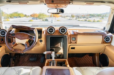 Starting with the underpinnings of a 2003 Hummer H2, the exterior of the Black Stallion was completely remodeled to include Military-style carbon fiber and Kevlar armor. The cabin was themed in the style of a high-end cigar lounge: From the diamond-stitched headliner to the custom floor mats, it’s all handcrafted. Even the rear cargo compartment contains trim inspired by Military bomber aircraft.