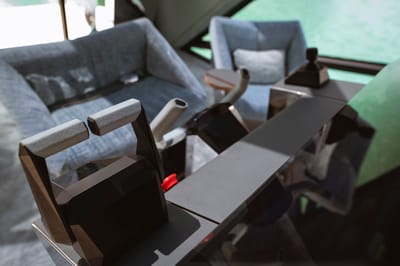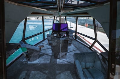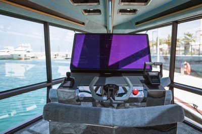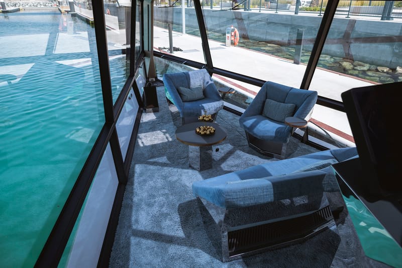 Step inside, and the interior of the yacht has good head heights thanks to an 'origami' style design which allows passengers to remain upright across the cabin. The cabin, separated into two lounge areas with a BMW-designed helm station, features rotating helm seats that allow the space to function either as part of the social area or independently. Each individual furniture piece is made of grainy metal which reflects sunlight around the cabin like waves on the water. At the center of the helm station is a 32 inch touch digital control unit with 6k resolution that has been designed to look and feel like the BMW iDrive operating system, with voice control also integrated into the system.