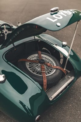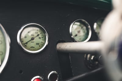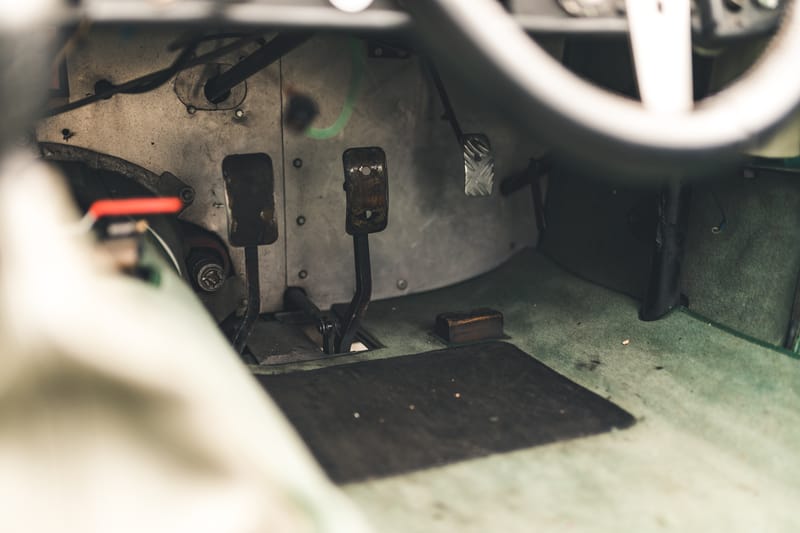 Inside, the small racing bucket seats are trimmed in olive-hued leather, and the minimal cockpit is fitted with carpet for a dash of road-going refinement. A full complement of mostly original Jaeger and Lucas gauges fills the flat dashboard. A three-spoke aluminum steering wheel wears the Tojeiro crest in its center.