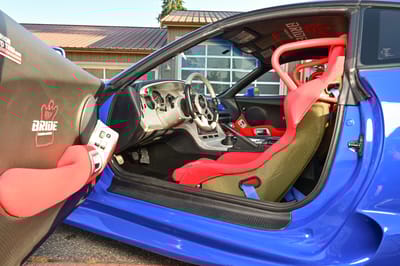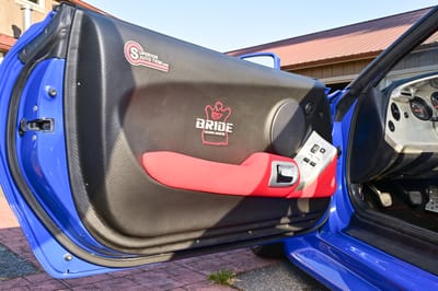 Moving up front, there’s a set of bright red Bride Dinos II carbon Kevlar racing seats and four-point safety harnesses.