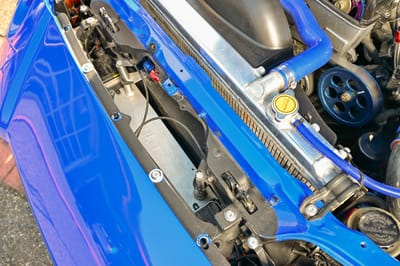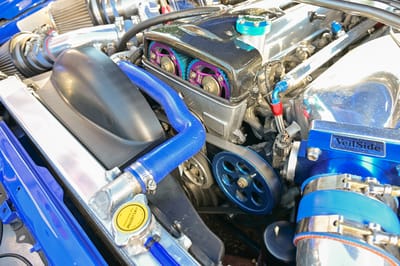 After having the 2JZ-GTE custom ported and polished, VeilSide supplied a surge tank manifold, 100 mm throttle body, and a high-flow fuel rail, with other goodies found in the engine compartment including an ARC oil filler cap, ARP head studs, TRD engine mounts, GReddy dual oil coolers, an oil filter relocation kit, pulley kit, oil catch tank, Fluidyne aluminum radiator, and FAL dual electric fans.