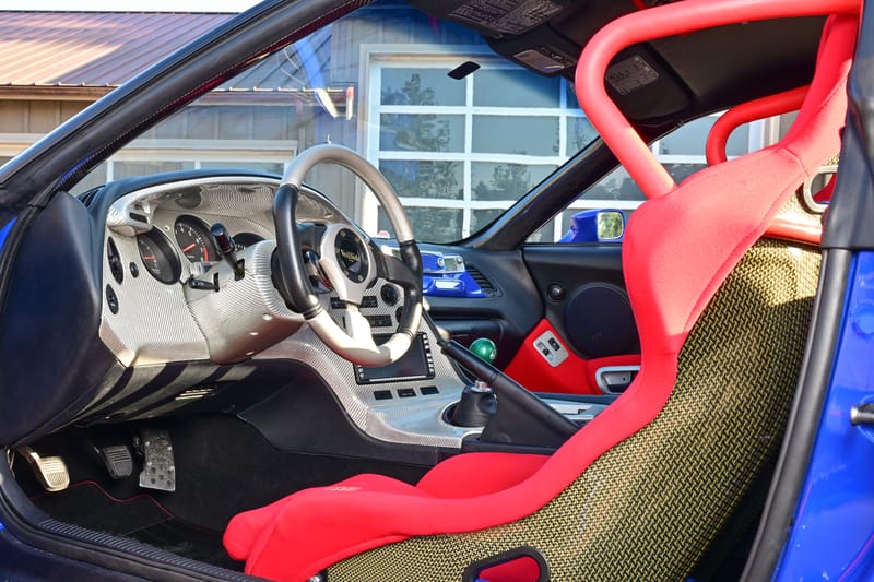 Every aspect of the exterior was modified into a sleek, unusual package; from the Veilside headlight conversion, to the aero mirrors, hood, custom carbon Kevlar rear spoiler, and custom-molded side skirts and rear panels.