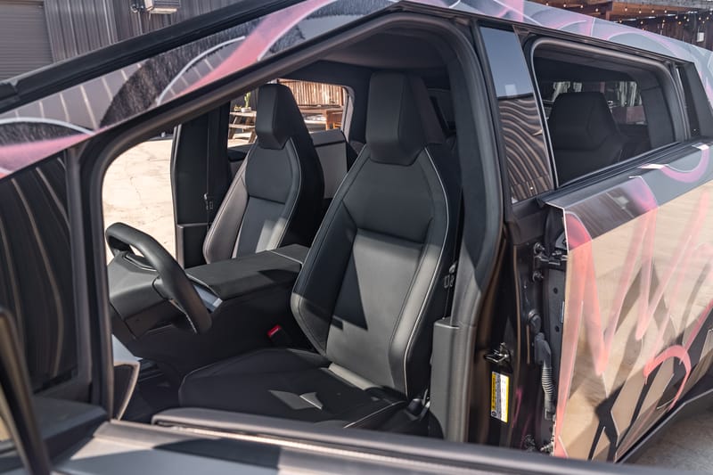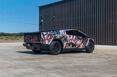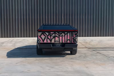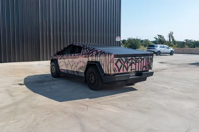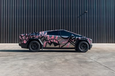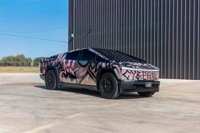 Under the eye-catching graffiti art lies that iconic stainless-steel bodywork over a black interior, with other notable features of this vehicle including variable-ratio four-wheel steering, adaptive air suspension, Full Self-Driving Capability, an electric retractable tonneau cover, eight anchor points for accessories, 20-inch Cyber wheels, automatic LED lighting, heated and ventilated front seats, front and rear touchscreens, eight exterior cameras, and a full-length roof panel that is constructed with impact-resistant acoustic glass.