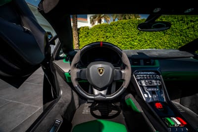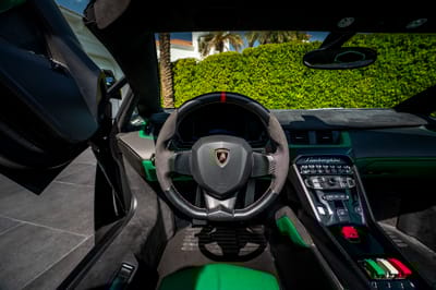 This example of the Veneno Roadster is finished in black with Verde accents over a Verde/Nero interior, and is powered by a 6.5-liter, 750 hp (552 kW) naturally-aspirated V12, running power to all four wheels through a seven-speed, single-clutch automated transmission. It has covered 1,778 km (about 1,108 mi), and is located in Dubai.