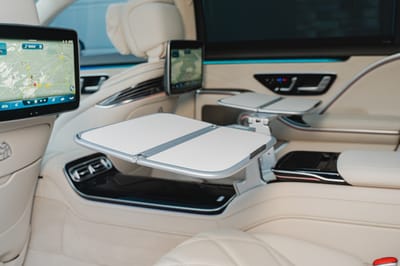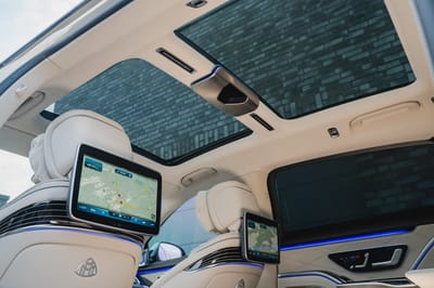Entering and exiting the first-class rear cabin can be done via hand gestures and power operation. No need to pull or push on anything at all. Like the rest of the interior, the headliner of this Maybach is swatched in leather. Burmester provides a sound system unlike any other with in-seat resonators and ear-level driver components.