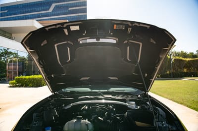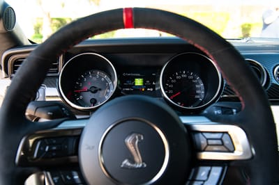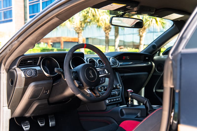 In GT350R spec, like the black beauty up for auction today, that greatness is clear. An 8,250-rpm redline. Three pedals. Ultra lightweight carbon fiber wheels. And for 2020 models, like this one, revised high-trail steering knuckles to improve steering precision and straight-line stability.