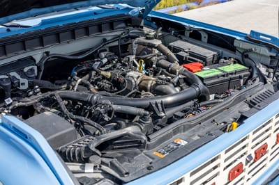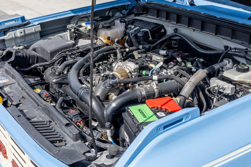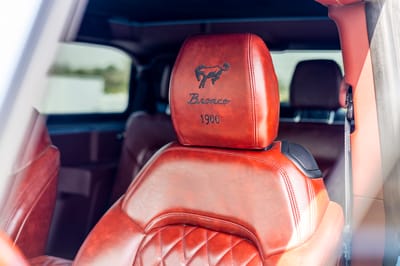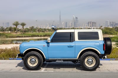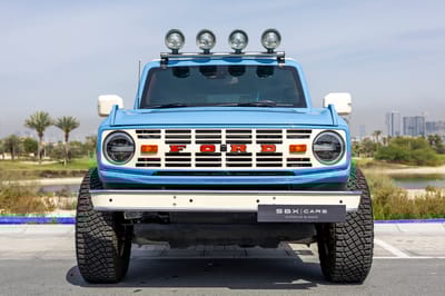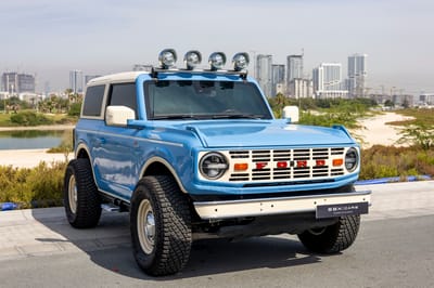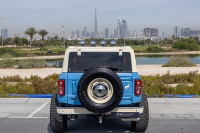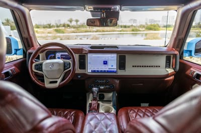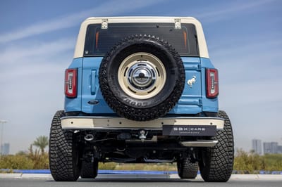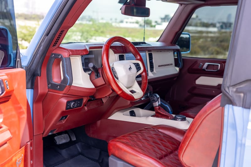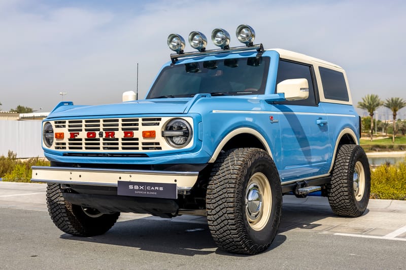 This custom Bronco Wildtrak was the culmination of a vision that pays homage to the original 1960s-era Bronco. The build was carried out by Power Dose in Dubai – a customization facility known for its expertise in Bronco conversions. There, the vehicle received a repaint in two-tone light blue and ivory along with period-correct chrome bumpers, auxiliary spotlights, side steps, a skid plate, a Borla exhaust system and a completely reupholstered German patina leather interior.