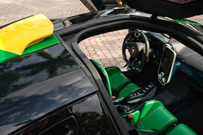 It features distinctive green and yellow body accents, a rear wing adorned with a Brazilian flag graphic, green leather upholstery embellished with embroidered Brazilian flags, green-tinted carbon-fiber interior trim, and a carbon-fiber steering wheel featuring green and yellow 12 o'clock markers.