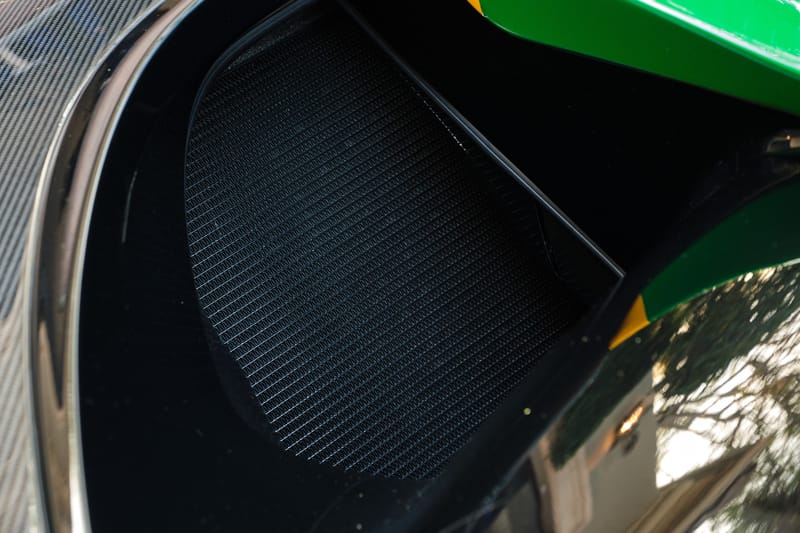 This Senna is a one-owner vehicle, with 571 miles covered, and full documented history. The Home Victory Edition features distinctive green and yellow body accents, a rear wing adorned with a Brazilian flag graphic, green leather upholstery embellished with embroidered Brazilian flags, green-tinted carbon-fiber interior trim, and a carbon-fiber steering wheel featuring green and yellow 12 o'clock markers.