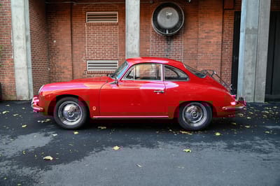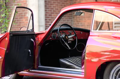 Picked up by its original owner in Germany via the European delivery program, this 356 B remained in California with the same family until 1988. In the 1990s, the original black leatherette interior was reupholstered with leather and the body was refinished in its factory shade of Ruby Red.