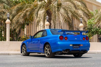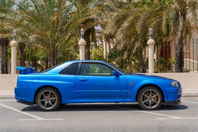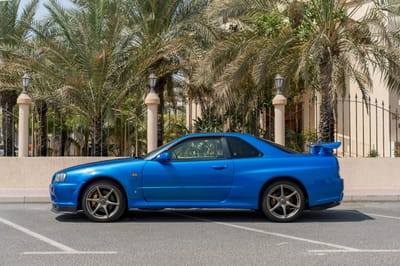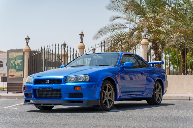 You guys—this is an R34 Nissan Skyline GT-R in Bayside Blue, and it is next-level iconic. Twin-turbo RB26, all-wheel drive, and JDM street cred for days. It’s not just a car—it’s a legend.
