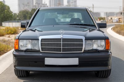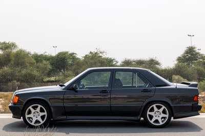 SBX Cars is proud to offer for sale this 1989 Mercedes-Benz 190E 2.5-16 sport sedan showing 87,288 kilometers at the time of this cataloging. Finished in charcoal metallic over a black leather and cloth patterned interior, it is offered in Dubai with an AutoHub report and a service booklet.