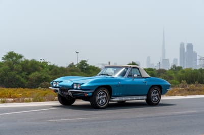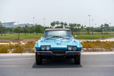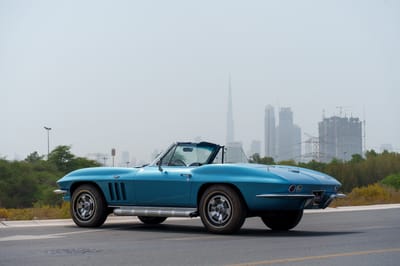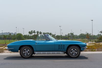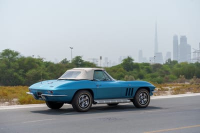 With guidance from Zora Arkus-Duntov and Bill Mitchell, Chevrolet put the sports car world on notice when it launched the second-generation Corvette. Dubbed the Sting Ray, it was all sharply creased bodywork and big V8s. Just like this blue beauty that goes a step further with that handsome white convertible soft top.