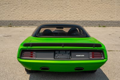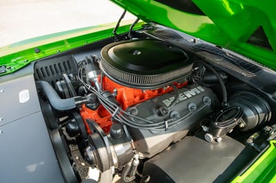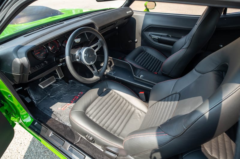 The chassis has been boxed, reinforced, and RAPTOR coated. The wheels are custom billet units. Wilwood supplied the brakes. An outrageous shade of Dodge Viper Snakeskin Green, with just a touch of extra gold, is separated from the gloss black roof by a hand-laid red stripe. AAR styling elements have been added. The cabin is loaded with touches like Speedhut Hemi Cuda-branded gauges and Vintage Air climate control.