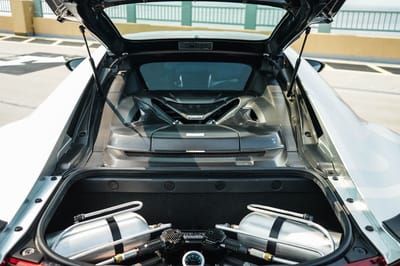 Today’s example benefits from a host of curated upgrades like the AimGain carbon fiber body kit and staggered-width Vossen wheels that dial up the aggressiveness, while the Air Lift Performance suspension and Fi Exhuast system offer variable performance at the touch of a button.