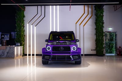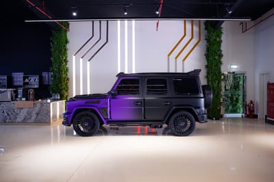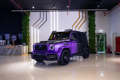 SBX Cars is proud to offer for sale this 2021 Mercedes-Benz AMG G63 P900 Limited Edition 50th UAE sport-utility vehicle showing 19,517 kilometers (12,127 miles) at the time of this cataloging. Finished in a purple-to-black satin gradient over a purple and yellow leather interior, this exclusive G63 is now offered for sale in Dubai.