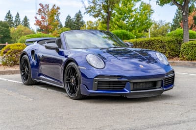 SBX Cars is proud to offer for sale this 2021 Porsche 911 Turbo S Cabriolet showing 22,018 miles at the time of this cataloging. Finished in Gentian Blue Metallic over a black leather interior, this 992.1 Turbo S is offered with two keys, a window sticker, and a clean CARFAX report.