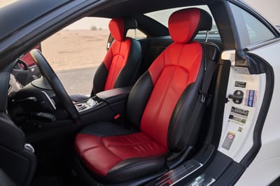 - Black leather with red inserts and stitching that extends to the door panels