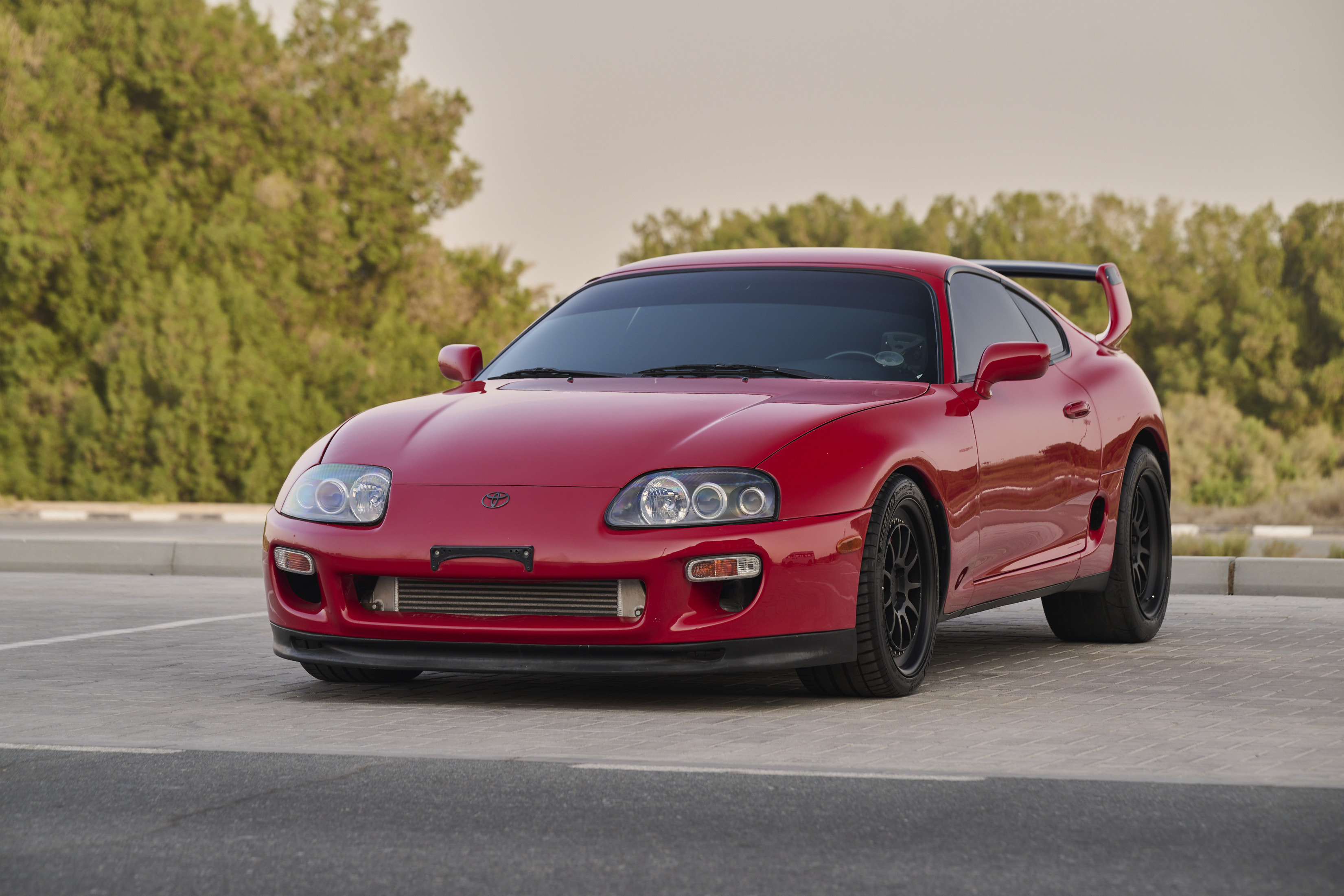 This 1994 Toyota Supra Turbo packs nearly 600 hp from its legendary 2JZ-GTE — finished in red with CCW wheels, an exposed intercooler, and the kind of stance that made the MkIV a global icon.