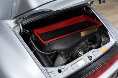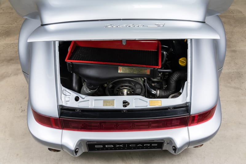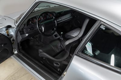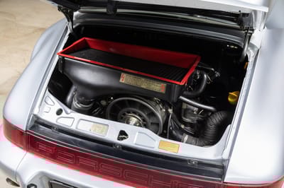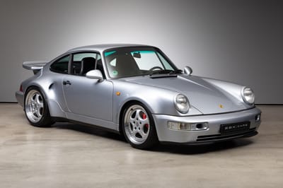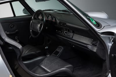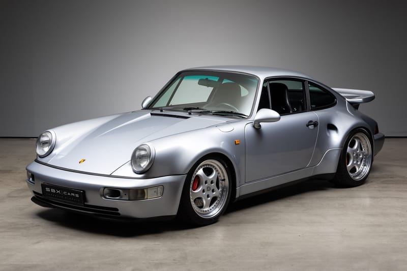 This 1992 Porsche 964 3.3 Turbo Lightweight is finished in silver over a black interior, and powered by a 3.3 liter turbocharged boxer 6 engine producing 383 hp, running power through to the rear wheels through a five-speed manual transmission. It has approximately 56,000 km (about 34,797 mi) covered.