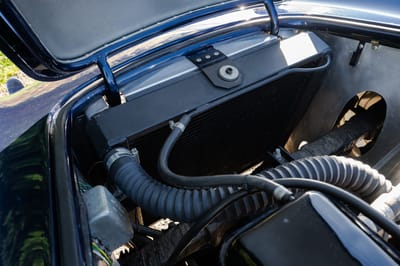 Mr. Angliss had fit the car with non-original chrome wire wheels but the owner wished to use his original set of Dunlop-manufactured 70-spoke enameled wheels. The owner notes that the front right wheel arch has a slight flat in the radius (shown in photos), which he states denotes that the alloy body was handmade on the original AC Cars "wooden bucks" like all original Mark II Cobras.
