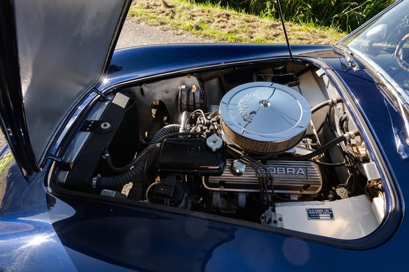 The car reportedly remained unfinished and in storage until 1986, when the owner inherited the Cobra following his mother’s death. The owner had known Brian Angliss, owner of AC Cars Ltd., for a number of years and in 1989 Mr. Angliss asked the owner if he wanted the car to be completed. A deal was struck to carry out the order in exchange for collectible Mauser Broomhandle firearms. It was restored to the original specification and colors, along with an upgraded alloy intake manifold and 650 cfm Holley carburetor to push power from 271 hp to more than 300.