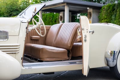 The 1937 Cord 812 Phaeton — a groundbreaking pre-war icon with hidden headlights, sleek Art Deco lines, and a V8 with a 4 speed electric shift selector and a top speed of 110 MPH that made it one of the most advanced cars of its time with features such as hidden headlights, door hinges, and convertible cover; and front wheel drive!