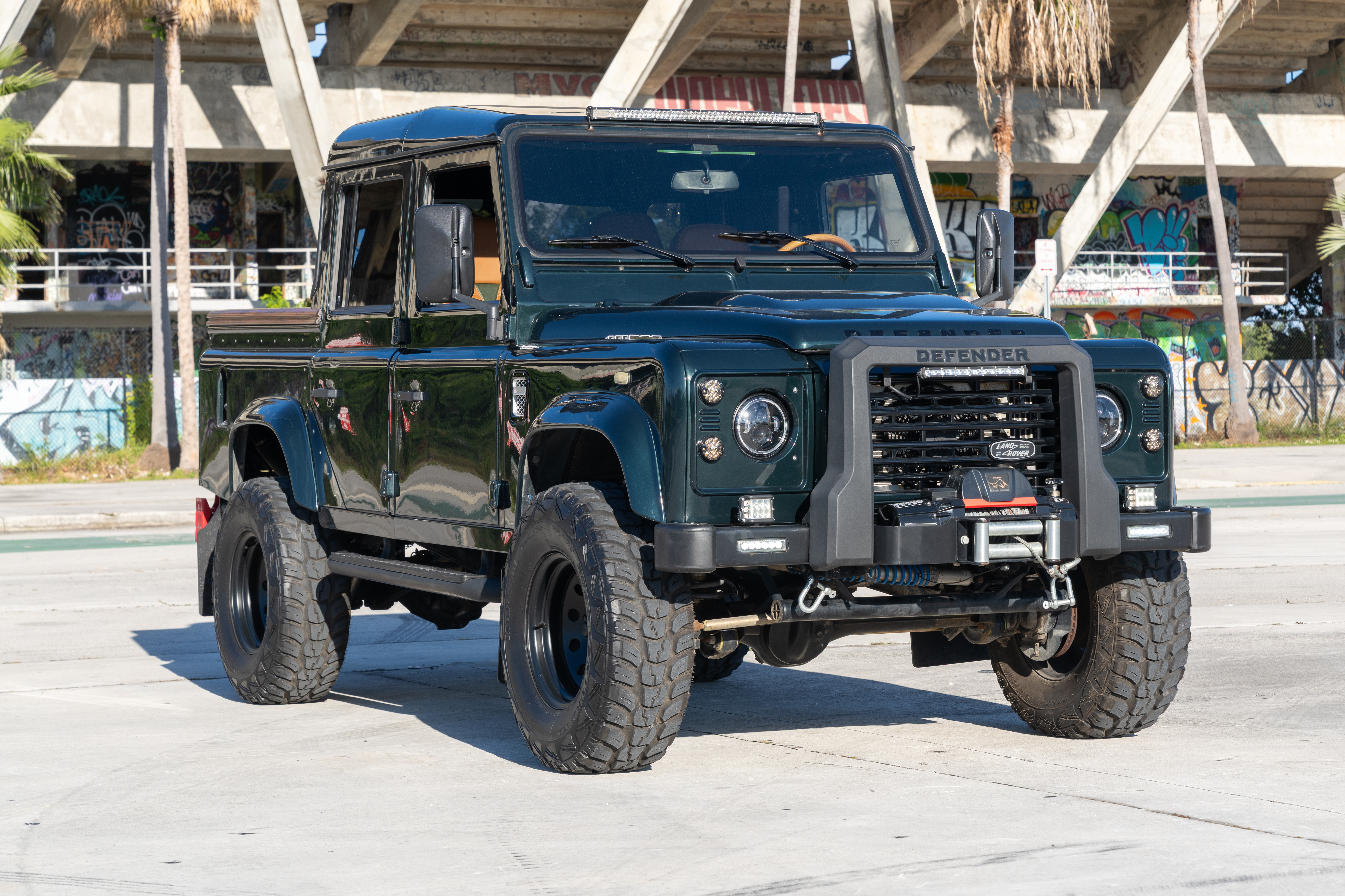 SBX Cars is proud to offer for sale this 1998 Land Rover Defender 110, showing just 81 km (50 mi) on the odometer at the time of cataloging. Finished in Metallic British Racing Green over a two-tone brown and green leather interior, this left-hand-drive crew cab pickup was built under license in Turkey by Otokar and comprehensively refurbished in the United States.