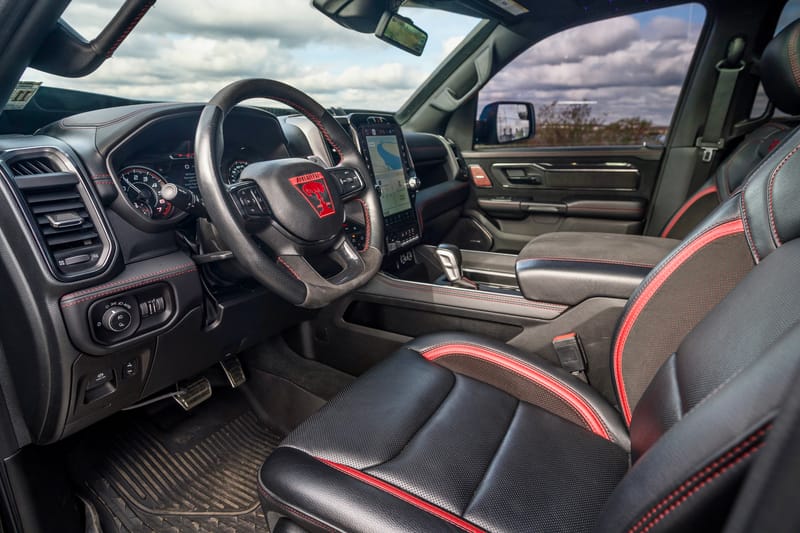 The RAM’s body was completely restyled from front to back, but the engineering changes went far beyond being just skin-deep. The factory TRX chassis was extended via a hand-fabricated steel frame that added a third live axle. Additional features included widebody angular coachwork, armored-style exterior coatings, carbon fiber accents, bespoke interior upholstery, weatherproof materials, and a set of six grippy 40-inch tires for maximum traction. This truck is absolutely unstoppable.
