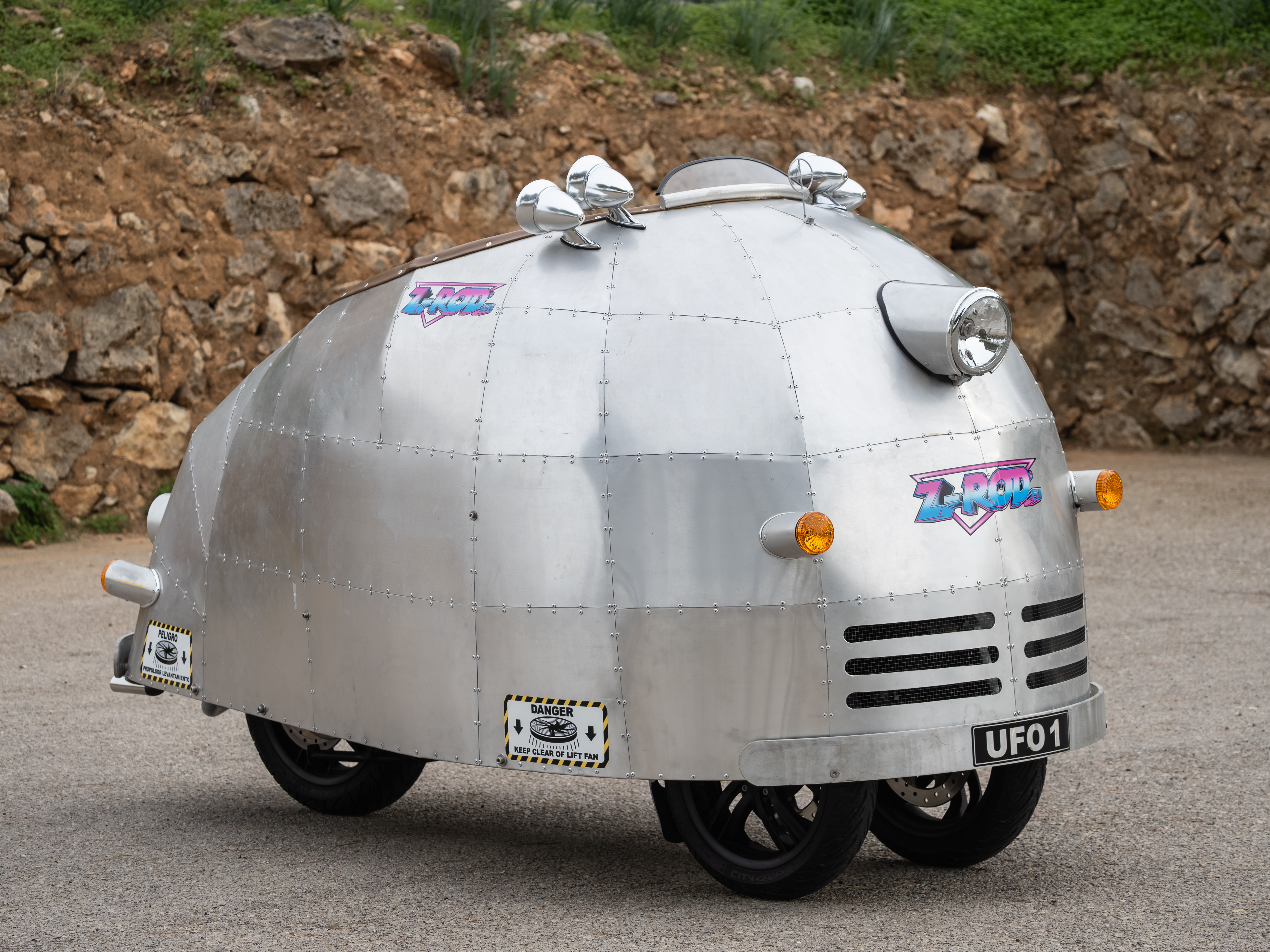 Developed from the creative imagination of ex-Formula One™ Promoter and experienced racer Marshall Pugh, the Z-ROD™ Strada Glide UFO 1 Prototype was brought to life through a detail-oriented custom build. It is perhaps one of the most unique and artful interpretations of compact modern-day transportation on the face of the planet (or beyond). Marshall started with a lightweight, agile, Italian-built Piaggio MP3 Yourban 300 LT, a three-wheeled reverse-trike known for its nimble handling and road-legal configuration. A completely custom exterior was meticulously cut and shaped by skilled fabricator Maestro Jordi using hand-milled, aircraft-inspired aluminum panels. Details include bespoke livery, a faux leather cockpit-top surround, custom exhaust routing, lighting, and more.