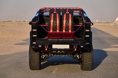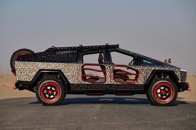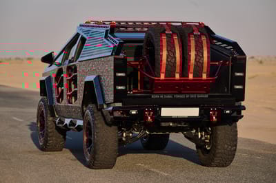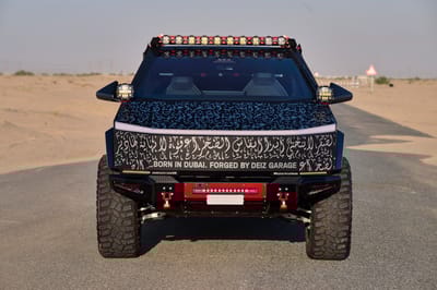 The DEIZ Garage Cybertruck was built by enthusiasts, for enthusiasts. The level of precision in each aspect of the build – from planning to execution – demonstrate extreme attention to detail. The DEIZ team accomplished something remarkable by taking the already capable Cybertruck platform and amplifying its capabilities with heavy-duty bumpers, auxiliary lighting, a suspension lift, custom wheels and tires, and innovative racks. Best of all, the truck pays homage to its Dubai-built origins with a custom Arabic-inspired wrap that will make an unmistakable statement wherever the truck goes.