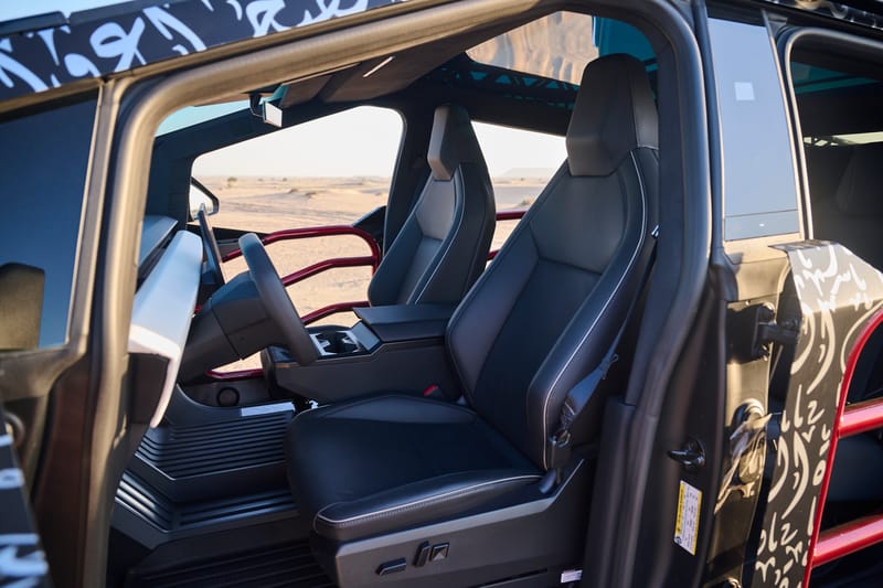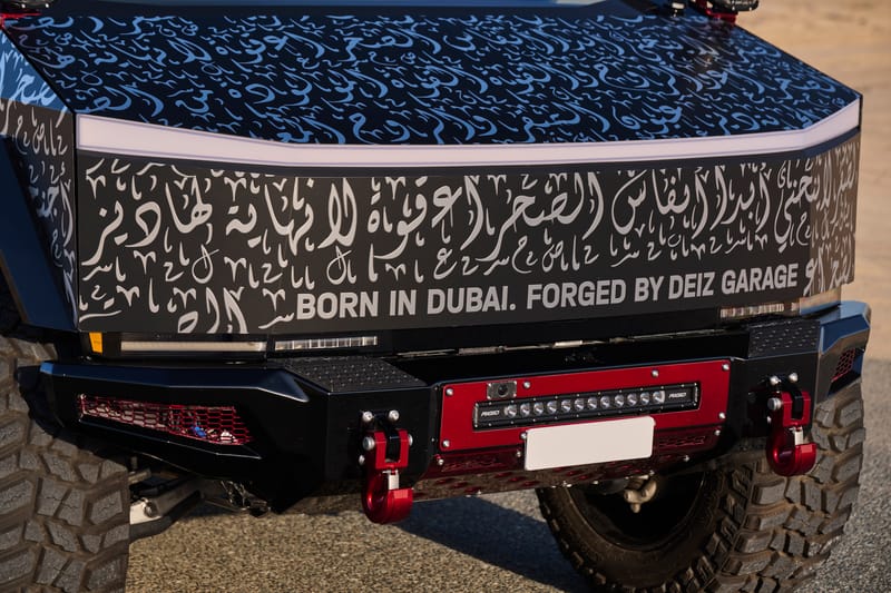 The DEIZ Garage process was both comprehensive and calculated: The build started with 3D scanning and design, followed by handcrafted production (laser-cutting, bending, and welding), painting, assembly, and final design. Capping it all off was an exterior wrap in Arabic calligraphy that encapsulated concepts of strength and freedom. Some of the phrases included “Falcon of the Desert,” and “Spirit Forged in Sand.” The Cybertruck became a truly capable expedition rig.