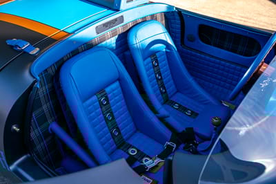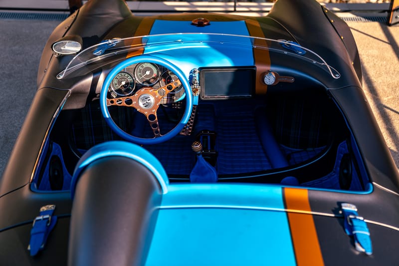 This retro-cool 550 Spyder tribute is pure eye candy: matte motorsport vibes, blue leather luxury, modern performance, and serious collector appeal—absolutely iconic, head-turning fun machine.