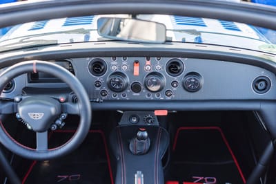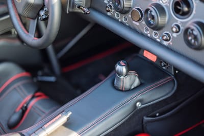 - Carbon fiber bucket seats featuring embroidered 70 emblems on the backrest with black leather and red stitching that extends to the door panels, center console, and shift boot