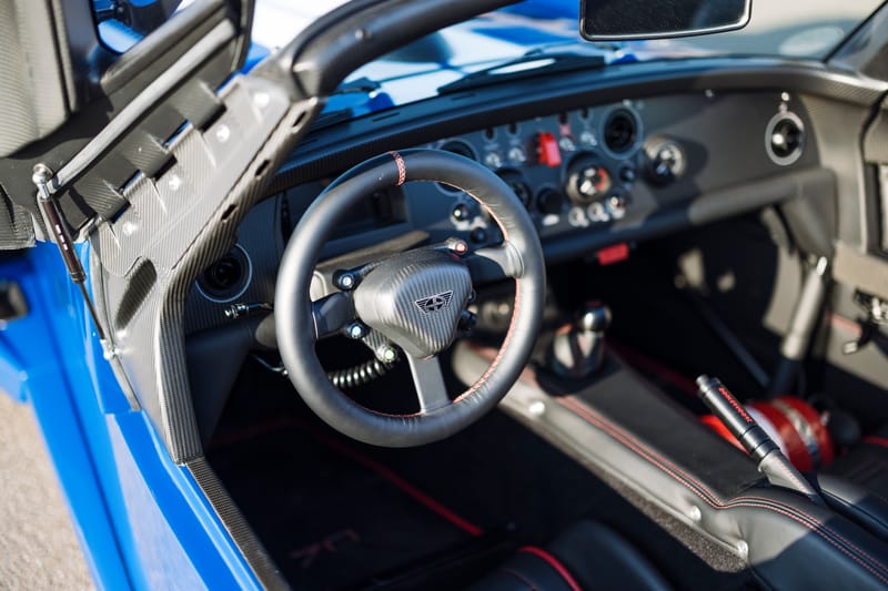 SBX Cars is proud to offer for sale this 2023 Donkervoort D8 GTO JD70 showing just 285 km (177 mi) on the odometer at the time of cataloging. Finished in Dark Blue over an exposed carbon fiber and black leather cabin with red stitching, this incredible ultra-light roadster was purpose-built to go fast.