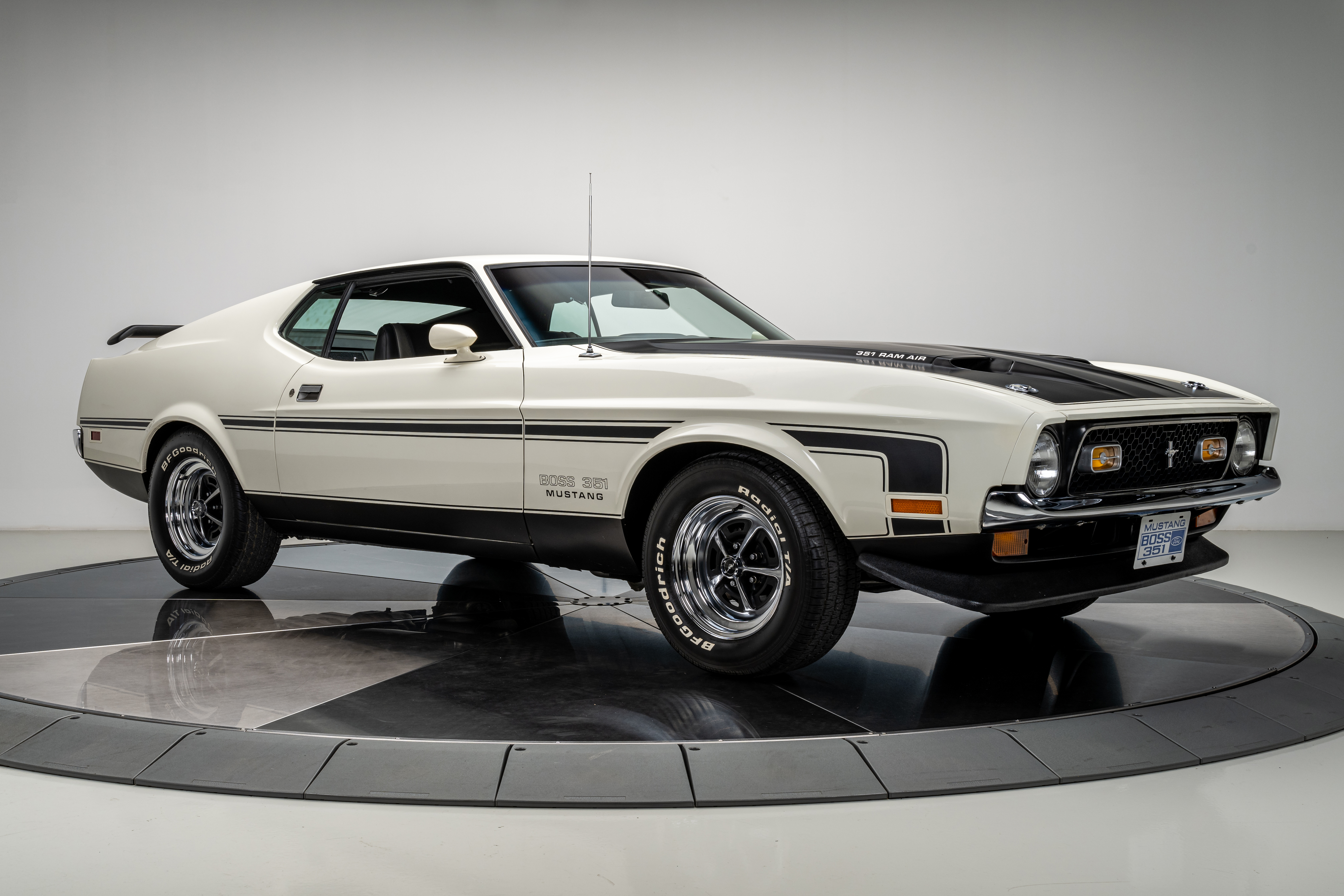 This example is documented as one of 1,806 Boss 351 Mustangs produced for the 1971 model year. It is one of 120 finished in White and one of only 6 produced in this color with Black Mach 1 bucket seats and chromed Magnum 500 wheels.