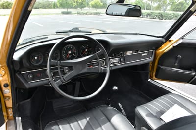 This eye-catching, unique Gold Metallic coupe comes from the last phase of the carbureted 911 models. It was treated to a cosmetic and mechanical restoration that exceeded $70,000 in expenditures in recent years. The car was brought back to life both inside and out, remaining accurate to its included signed Porsche Certificate of Authenticity. Even intricate components like the seals, hood struts, and hardware were replaced wherever possible.