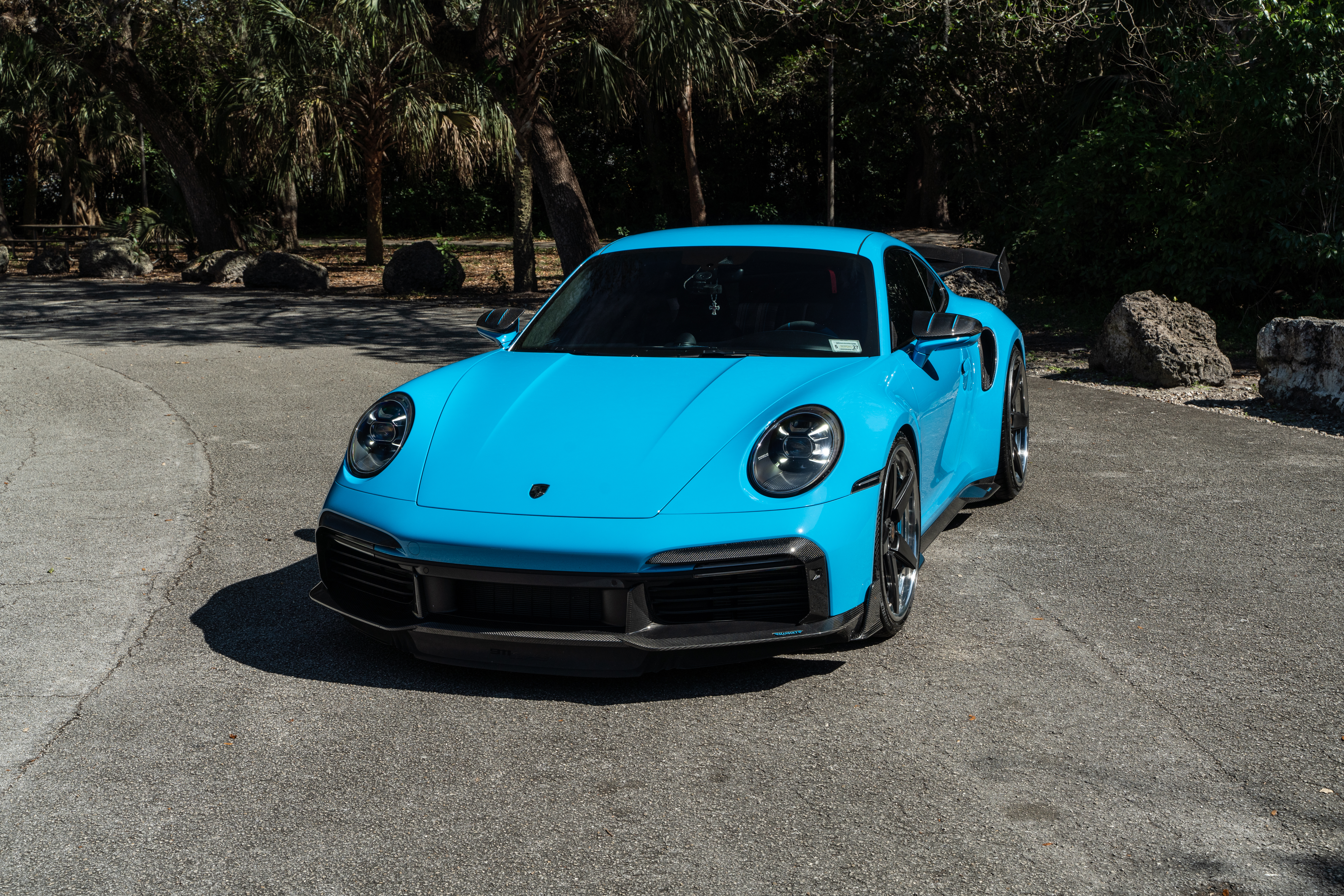 SBX Cars is proud to offer for sale this 2022 Porsche 911 Turbo coupe showing just 9,881 miles on the odometer at the time of this cataloging. Finished in Paint-to-Sample Riviera Blue over a black leather and plaid cloth interior, this 992.1 Turbo is offered in Florida with uninstalled original parts, a window sticker, documentation, a clean CARFAX report, and a clear title.
