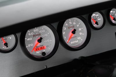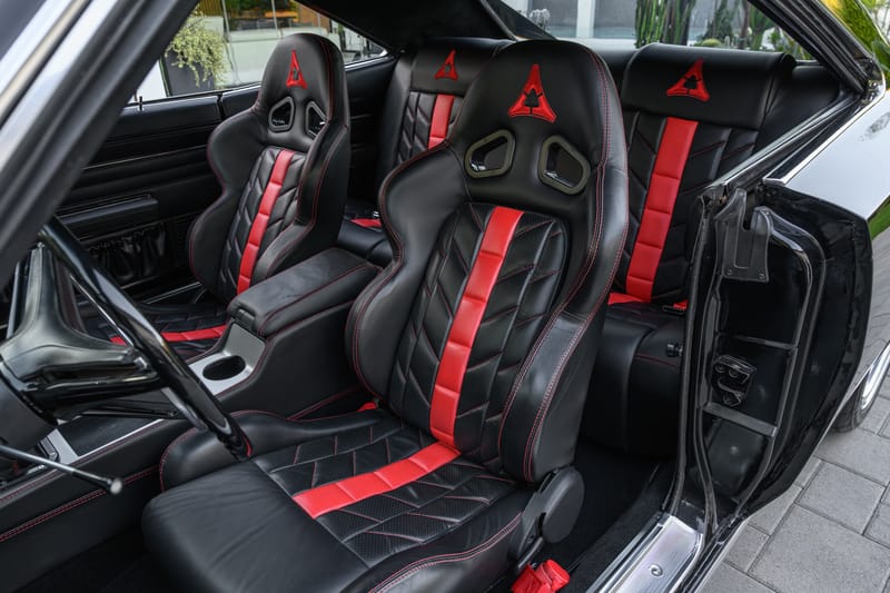 The cockpit was designed to be a place of cruising comfort, starting off with a pair of form-fitting Corbeau bucket seats with added cushion, a custom center console, and Vintage Air A/C. The Kenwood audio system features all-new speakers, including a cleverly-engineered enclosure for the trunk-mounted amplifier and subwoofer. The setup is capped off with adaptive LED ambient lighting and Dynamat sound-deadening material.