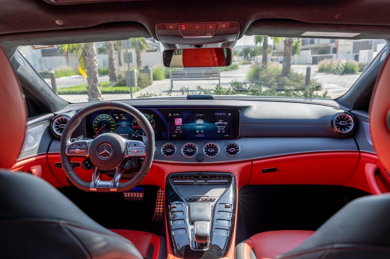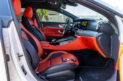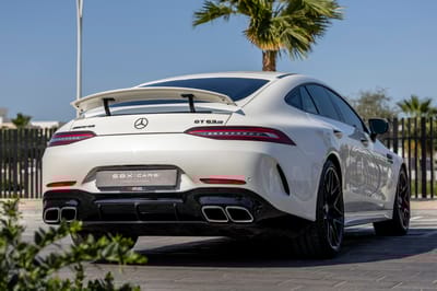 This fully loaded AMG GT63 S stands out with carbon-ceramic brakes and gold-finished calipers, 21” AMG forged wheels, and a sharply tailored cabin wrapped in two-tone leather and carbon fiber. Massaging and climate-controlled front seats, heated rear seating, and immersive ambient lighting elevate the experience, while the 360-km/h instrument display and motorsport-inspired steering wheel reinforce its performance focus.