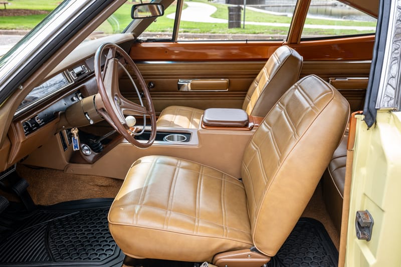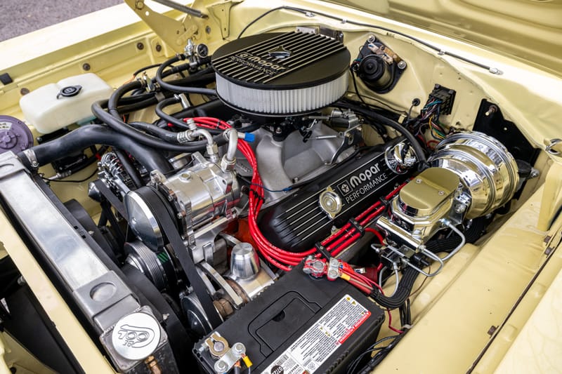 This Road Runner restomod has been driven only about 1,000 miles since a complete cosmetic and mechanical overhaul. It has been transformed into a high-performance “pro-tourer” that outperforms original factory legends using modern engineering and technology. The engine bay showcases the car’s main attraction: a crate-sourced, 505-horsepower “Wedge” 500ci Mopar Performance V8 with a myriad of polished billet accessories and a Be Cool aluminum radiator. The engine produces massive torque, so traction is optimized with a grippy set of Mickey Thompson GT Street slicks at the rear.