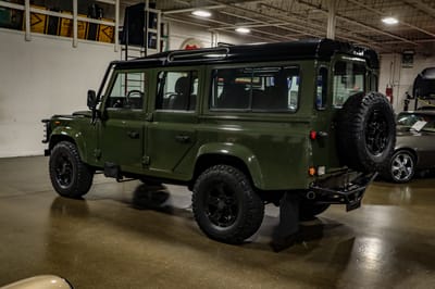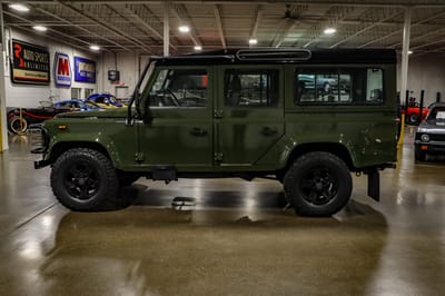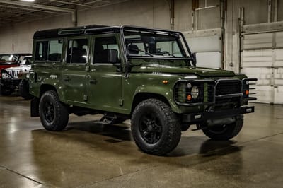 This 1986 Land Rover Defender 110 sport-utility vehicle shows 117 miles at the time of this cataloging. Finished in Eastnor Green over a black cloth interior, it is offered by Garage Kept Motors with a clean title.