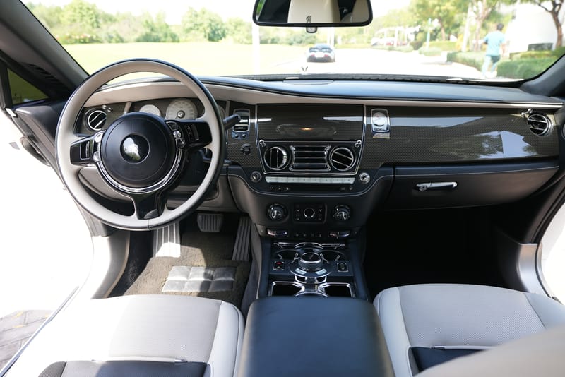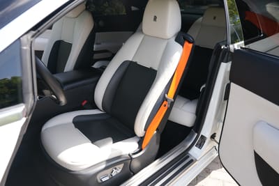 Inside, the cabin is outfitted in two-tone Ivory and Black leather. The wood veneer accents you might expect to see in a Rolls-Royce interior are instead finished in glossy carbon fiber that come in the Black Badge Edition. This example is also fitted with the Starlight headliner for a mesmerizing passenger experience, day or night. The custom-installed Hermes-inspired orange seatbelts remain, however.