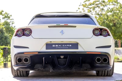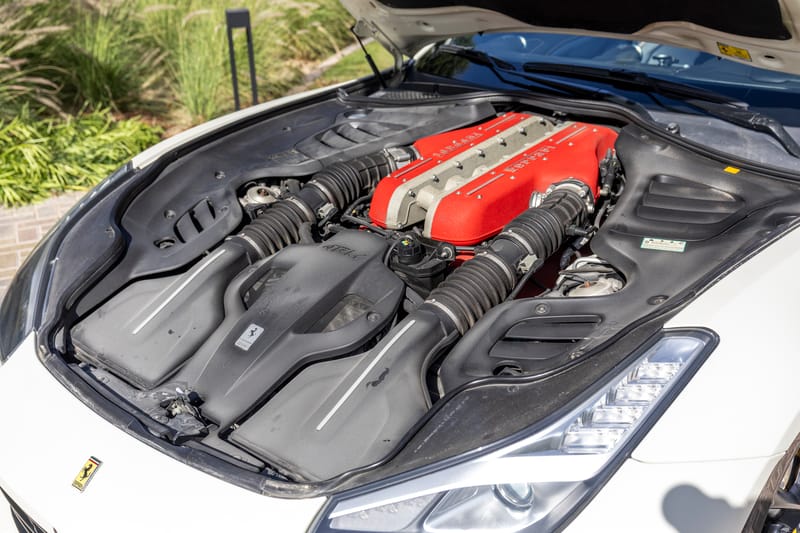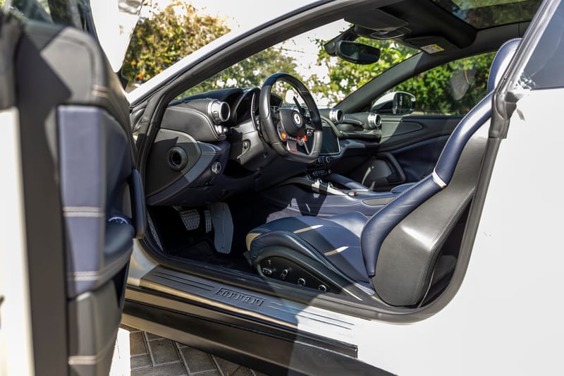 This 2017 Ferrari GTC4Lusso, showing 45,935 km (28,500 miles) on the odometer at the time of cataloging, is finished in matte white over a Sterling Blue and Tortora leather interior. Originally delivered as a launch demo car, it pairs Ferrari’s spectacular naturally aspirated V12 with a highly optioned, driver-centric cabin.