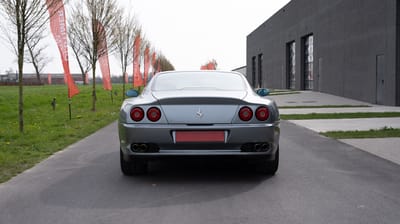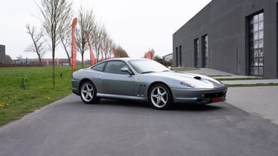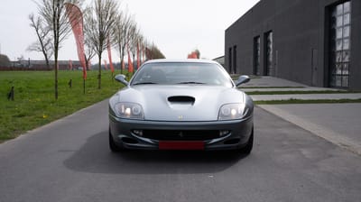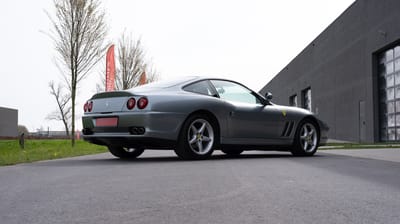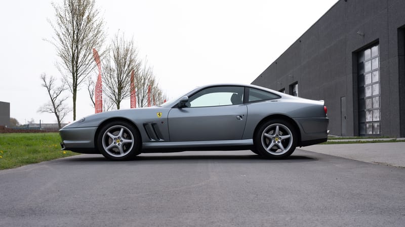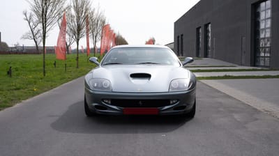 This 1997 Ferrari 550 Maranello, showing 74,944 km (46,568 miles) on the odometer at the time of cataloging, is finished in Grigio Titanio over a Nero leather interior. Delivered new in Germany, it has since spent time in Italy and Belgium, and comes with a full set of factory books, tools, and a well-documented service history.