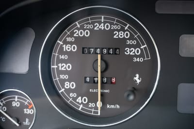 • 340-kmh speedometer with inset odometer reading 74,944 km