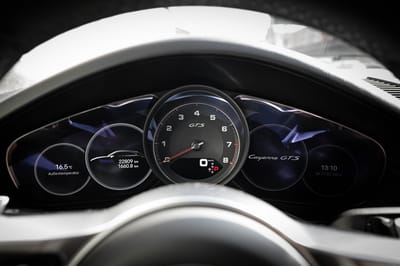 The spec leans into the Porsche GTS formula. Black paint, optional black RS Spyder Design wheels, and red calipers give it a menacing vibe, while details like the clear taillights, roofline spoiler, and wide rear rubber hint at what it can do. Inside, the Race-Tex surfaces, GTS-embroidered seats, and Sport Chrono package reinforce its driver-focused setup, with modern amenities like the rear entertainment rounding out the cabin.